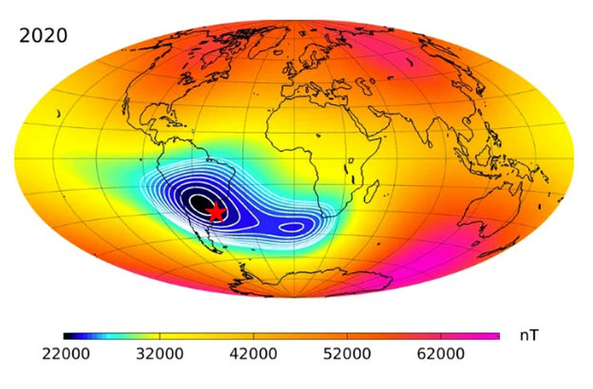 Южно-Атлантическая аномалия расположена над Бразилией и прилегающей акваторией Атлантического океана. В этой зоне заряженные частицы из радиационного пояса Ван Аллена могут подходить к поверхности Земли ближе, чем в других регионах.