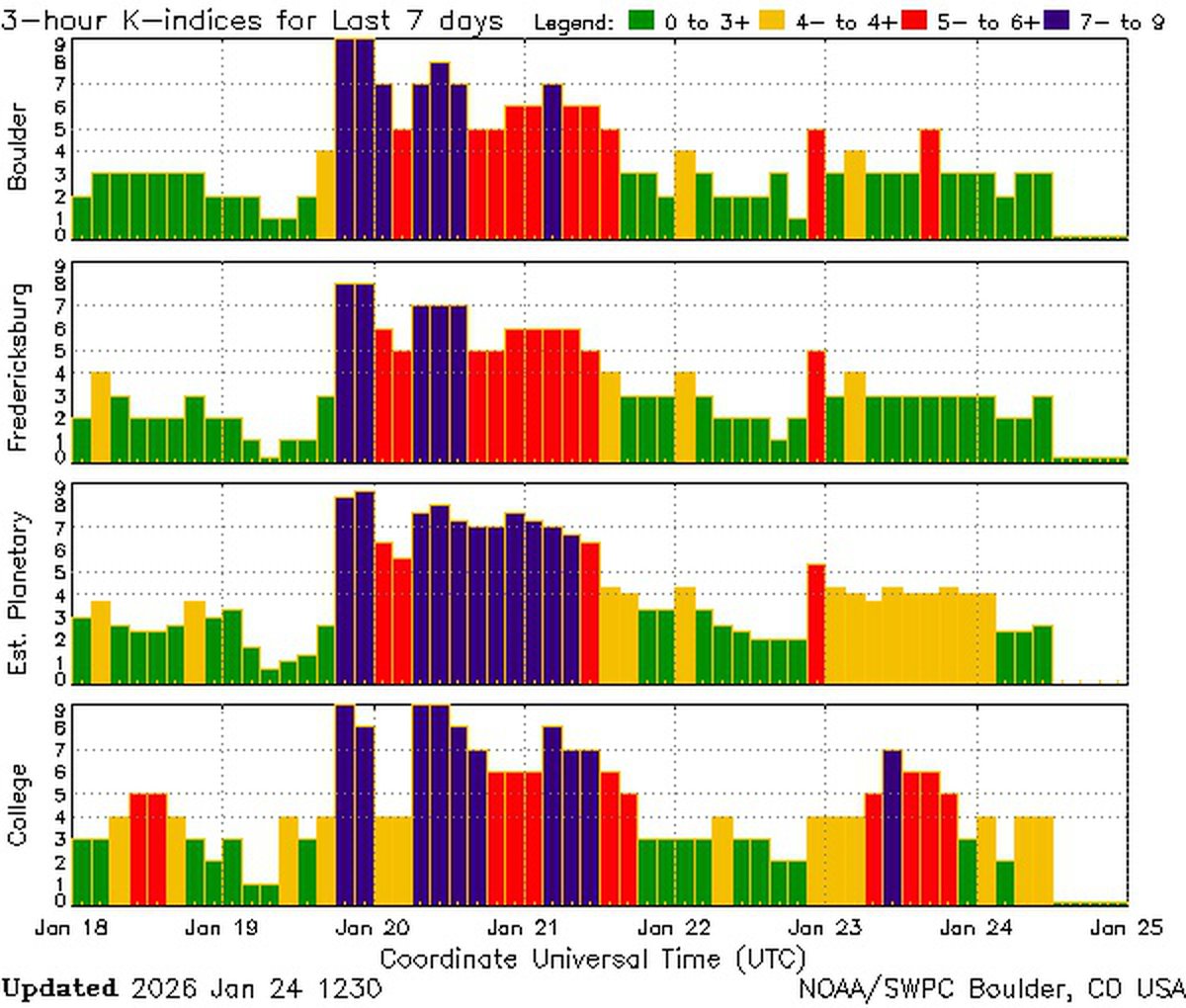 Геомагнитная обстановка 25 января будет спокойной, считают аналитики NOAA США и британского Met Office, но это не точно. На 24 января аналитики тоже предсказывали спокойствие, между тем сейчас в некоторых регионах планеты наблюдается магнитная буря класса G1.
