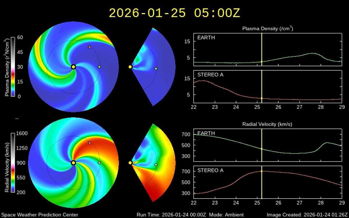 Если верить модели распространения солнечного ветра WSA-Enlil, 25 января тоже есть шанс на внезапную магнитную бурю. Хотя Земля почти вышла из потока частиц, которому мы обязаны последними штормами, на подходе еще один поток.