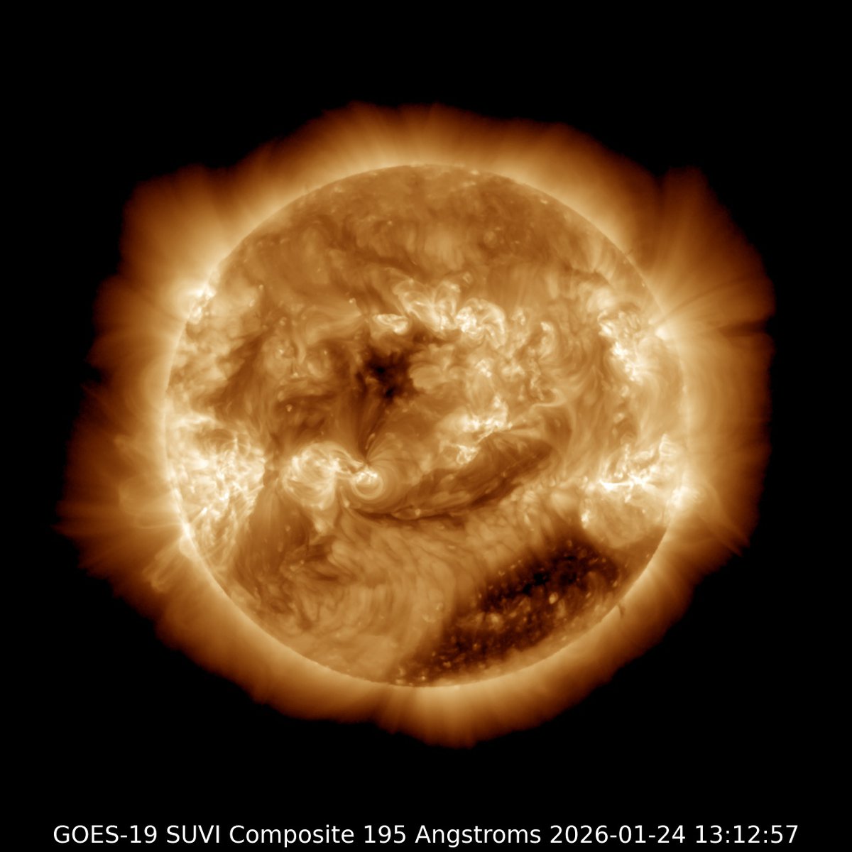 Сейчас солнечный ветер из корональной дыры в атмосфере звезды — это единственный заслуживающий внимания источник возможных геомагнитных бурь. Хотя на видимой части звезды есть девять пятен, ни одно из них не обладает нестабильной конфигурацией магнитного поля.