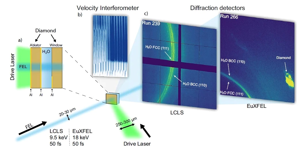 В рамках эксперимента исследователи воссоздали суперионную воду в лабораторных условиях. Для этого обычную воду сжимали между двумя алмазными блоками до давления примерно в 1.8 миллиона атмосфер, а затем нагревали до температуры свыше 2 тысяч градусов Цельсия.