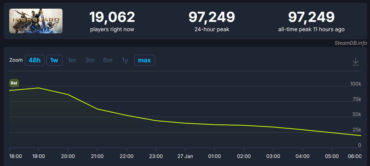 При этом релиз Highguard оказался не очень масштабным. Хотя игра распространяется бесплатно, на старте онлайн оказался лишь чуть выше 97 тысяч человек; сейчас этот показатель упал ниже 20 тысяч.