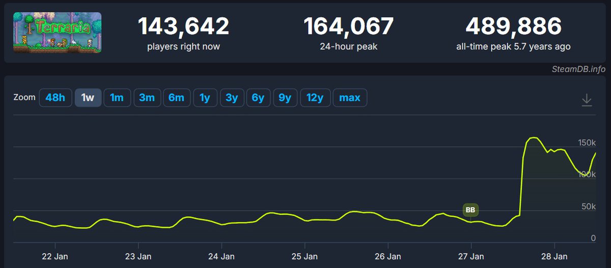 Очередной «финальный» патч для Terraria — большое обновление 1.4.5 — заметно нарастил онлайн в игре. Вскоре после релиза количество одновременных игроков в Steam-версии Terraria почти достигло 165 тысяч человек.