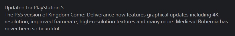 В PlayStation Store не указано, когда состоится релиз обновленной версии Kingdom Come: Deliverance с поддержкой PlayStation 5. По появлению информации об особенностях версии можно предположить, что ждать осталось недолго.