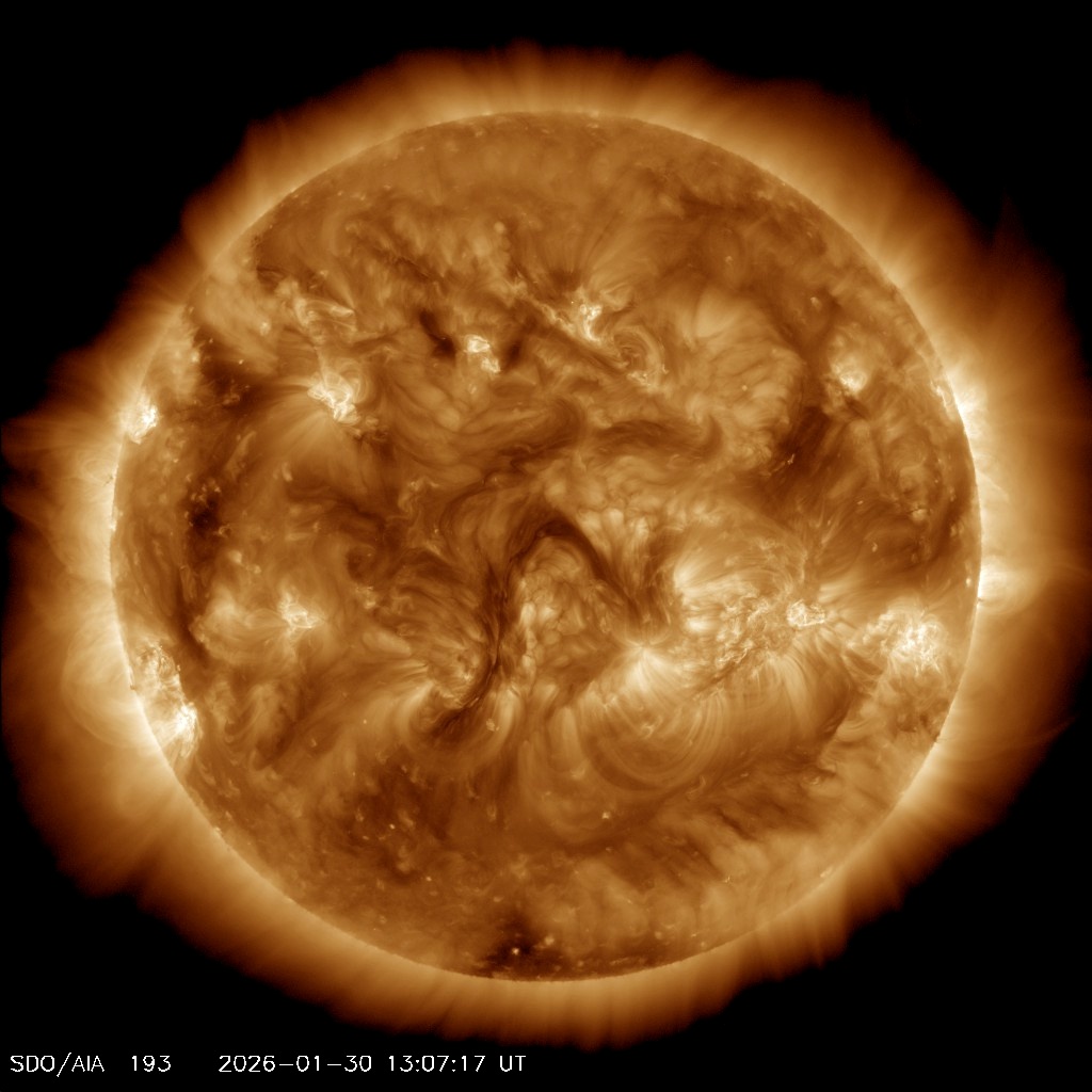 Крупные корональные дыры на снимках Солнца тоже не видны. Область, напоминающая корональную дыру, находится на краю солнечного диска, но пока сложно достоверно оценить ее размеры; выглядит так, словно она обладает небольшой площадью.