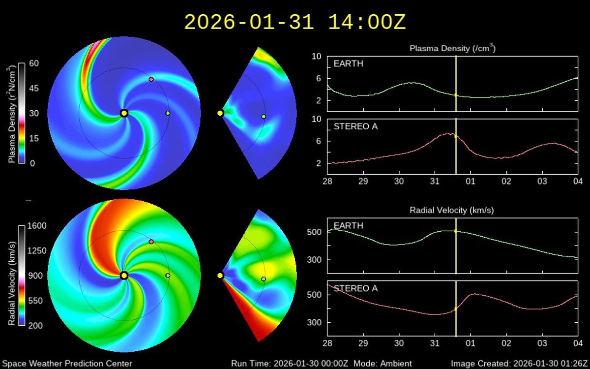 Согласно модели распространения солнечного ветра WSA-Enlil, 31 января Земля будет проходить по границе между двумя потоками частиц: побыстрее и помедленнее. Аналитики считают, что скорость плазмы в районе планеты не превысит 500 километров в секунду.