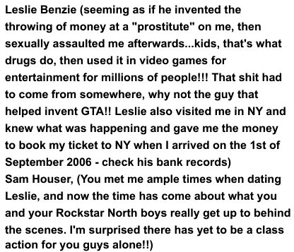 В частности, в опубликованных файлах содержатся обвинения в адрес бывшего президента Rockstar North Лесли Бензиса и сооснователя Rockstar Сэма Хаузера. Одна из жертв, Сара Рэнсом, обвиняла их в сексуальном насилии.