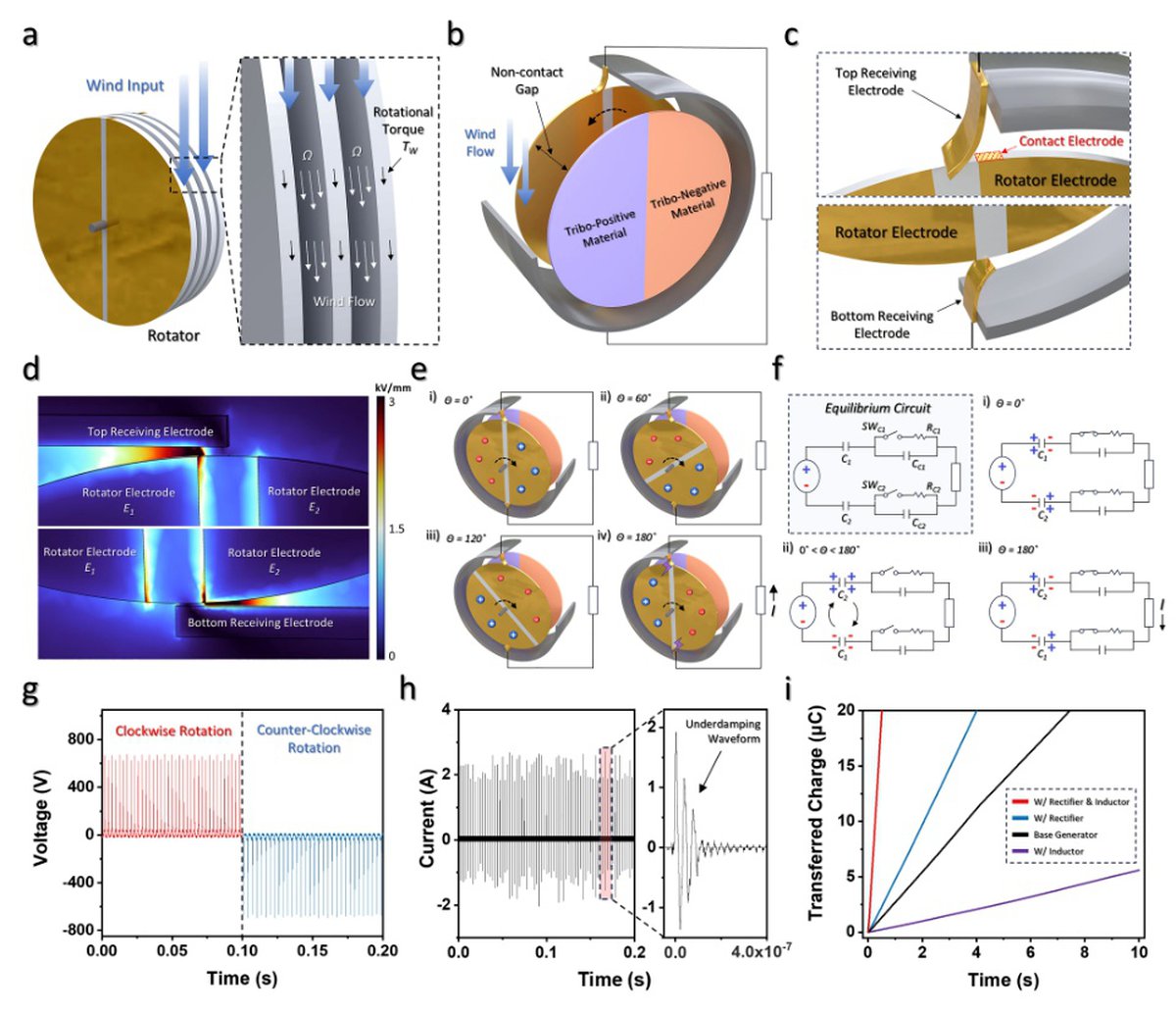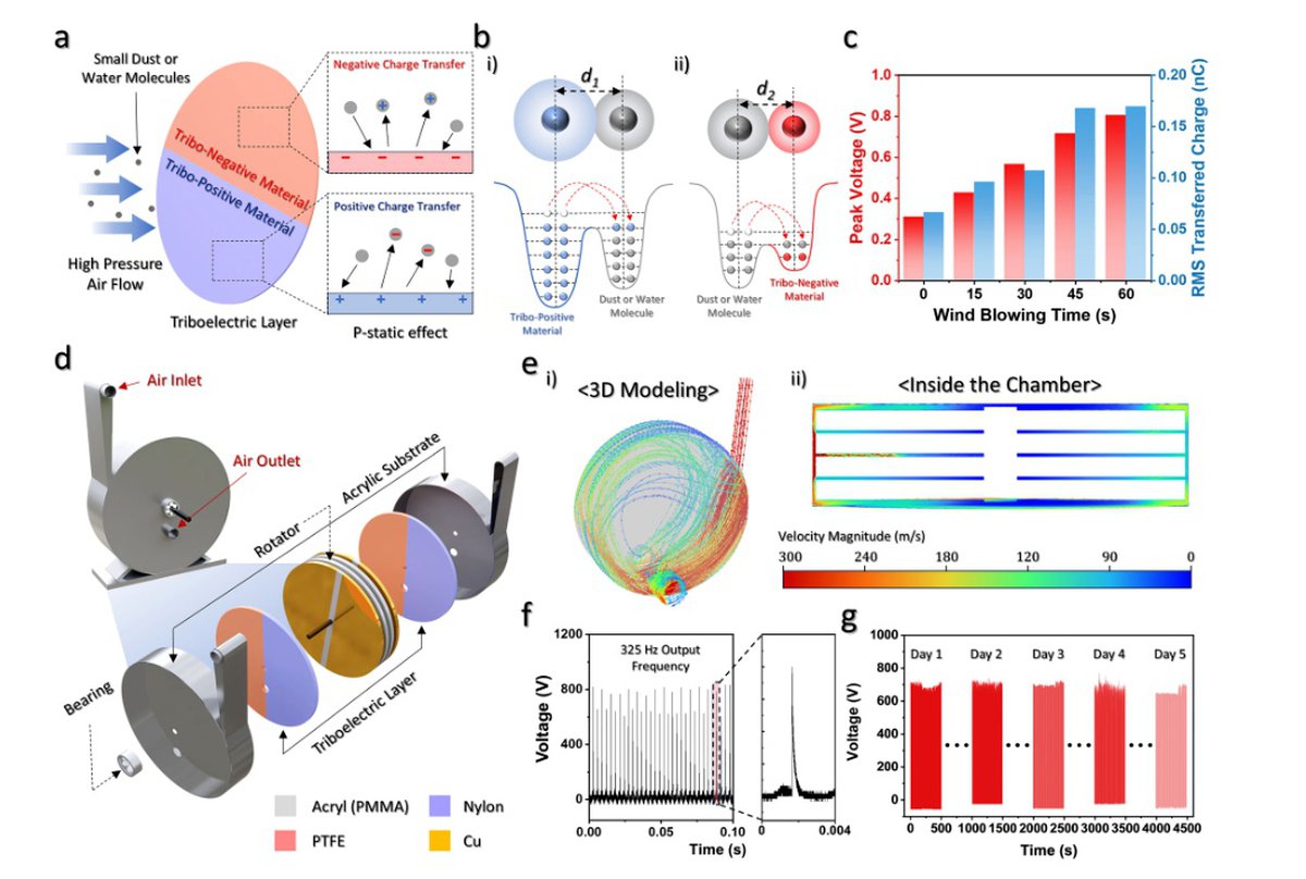Как поясняют исследователи, поток воздуха высокого давления создает внутри генератора вращательное движение, при этом трибоэлектрические слои получают поверхностный заряд без прямого контакта. Это позволяет вырабатывать электричество за счет электростатической индукции.