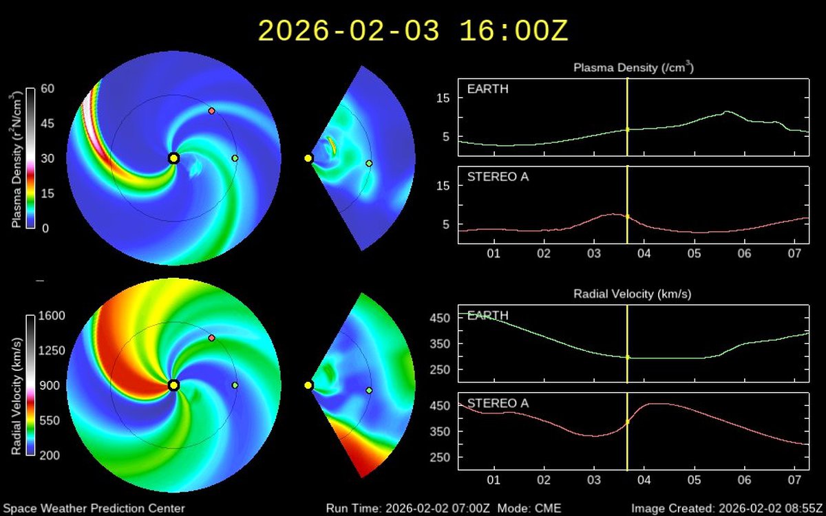 Если верить актуальной модели распространения солнечного ветра WSA-Enlil, корональные выбросы окажутся в районе нашей планеты не раньше 5 февраля. Это значит, что потоки плазмы движутся необычно медленно; как правило, они доходят до Земли за пару дней.