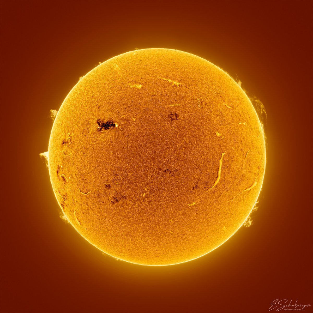 Астрофотограф Эдуардо Шабергер Пупо заснял огромное солнечное пятно AR4366 — самое активное пятно нынешнего солнечного цикла. За последние дни пятно породило несколько десятков вспышек.