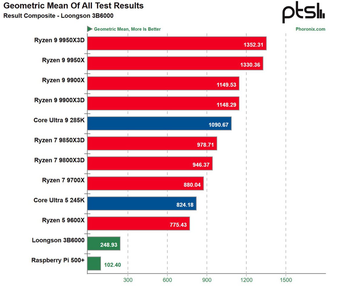 В сводных бенчмарках производительность Loongson 3B6000 составила около трети от показателей Ryzen 5 9600X. В то же время процессор сумел обойти Raspberry Pi 500 примерно в 2.5 раза.
