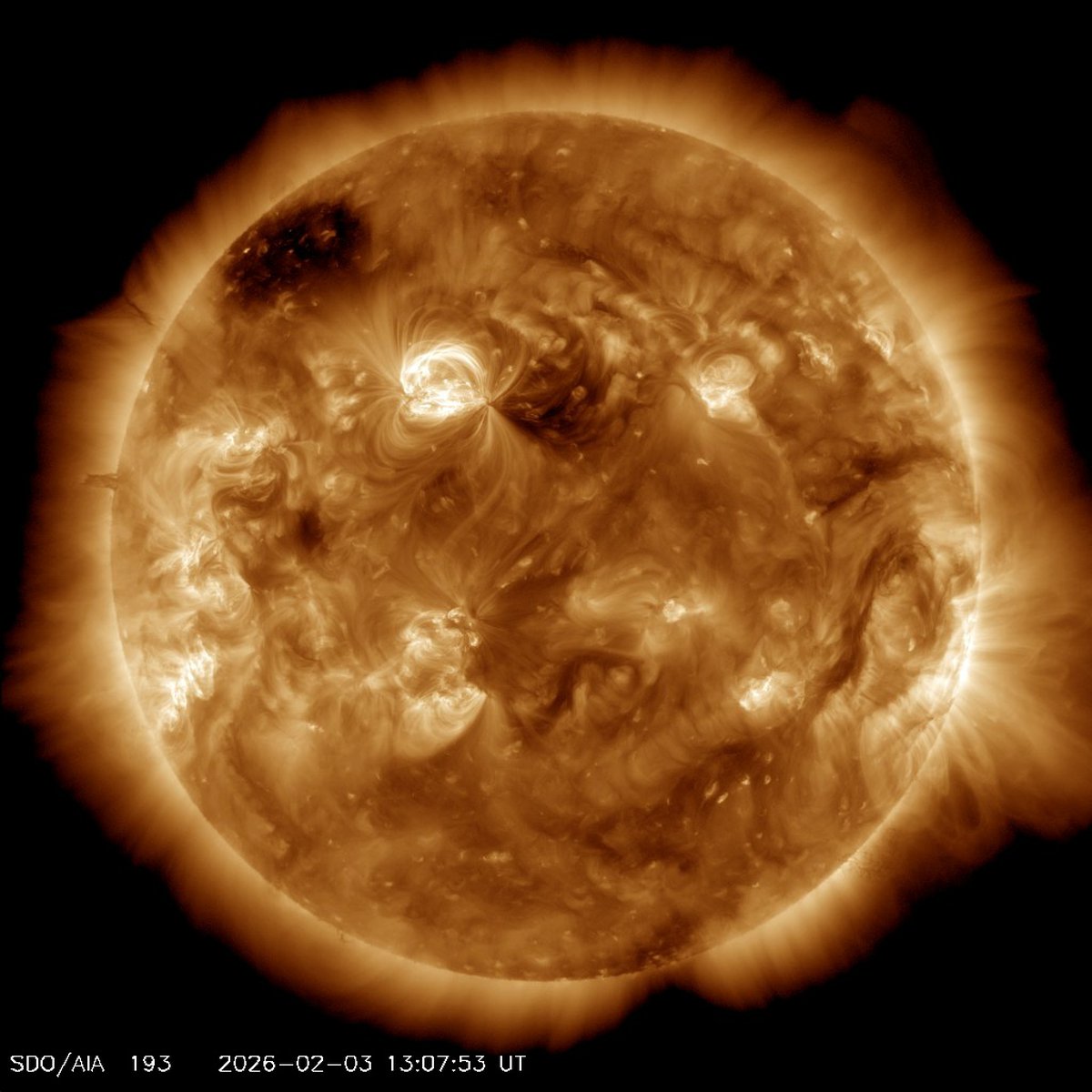Кроме того, вскоре на магнитосферу Земли начнет влиять крупная корональная дыра в северном полушарии Солнца: она постепенно разворачивается к Земле. Возможно, поток плазмы из корональной дыры достигнет нашей планеты как раз в районе 6 февраля.