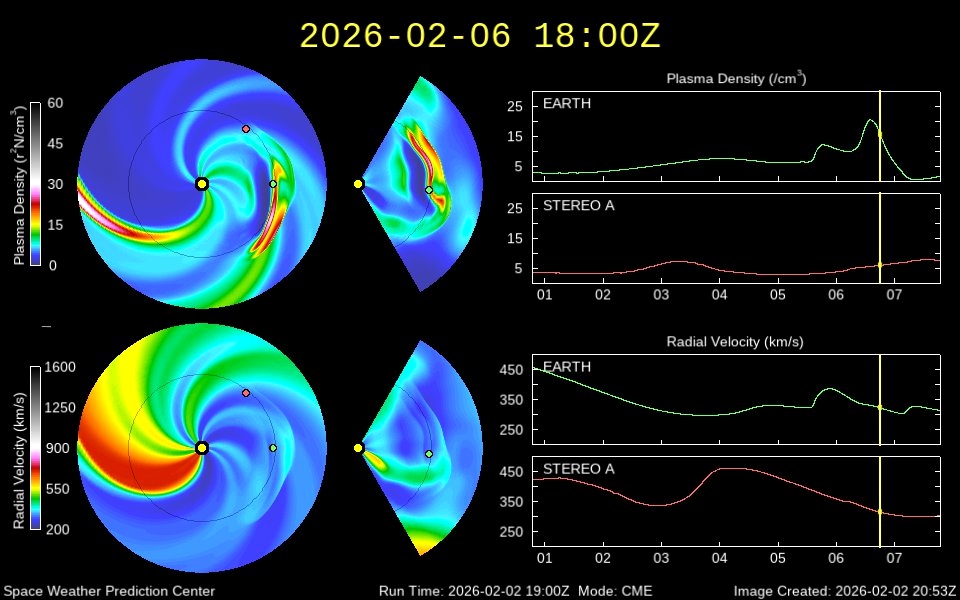 Судя по модели распространения солнечного ветра WSA-Enlil, два корональных выброса идут на некотором расстоянии друг от друга. Первый выброс зацепит Землю краем, зато плазма второго выброса как следует «заедет» по нашей планете.