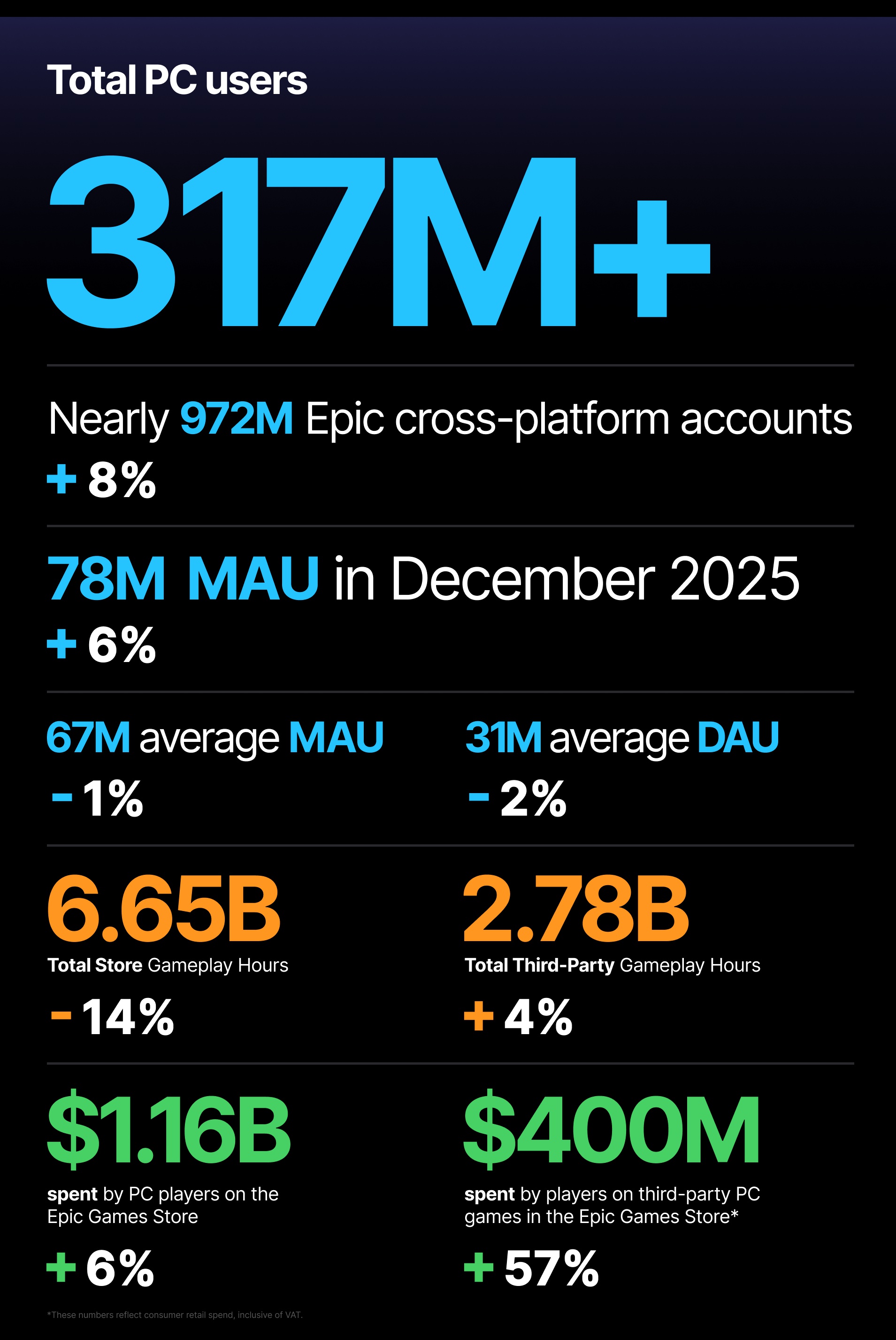 Падение ряда показателей не привело к снижению выручки площадки. В 2025 году игроки потратили в Epic Games Store $1.16 миллиарда, на 6% больше, чем годом ранее. Правда, затраты на сторонние игры выросли сразу на 57%, до $400 миллионов — выручка собственных проектов Epic Games (то есть Fortnite) тоже упала.