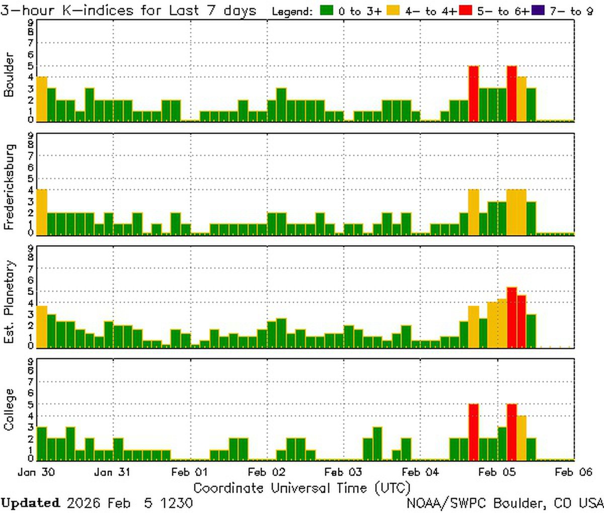 На вероятность таких бурь указывает геомагнитная обстановка 5 февраля. Изначально аналитики тоже предупреждали о короткой магнитной буре в районе полуночи, в реальности мы, видимо, серию коротких штормов на протяжении всего дня.