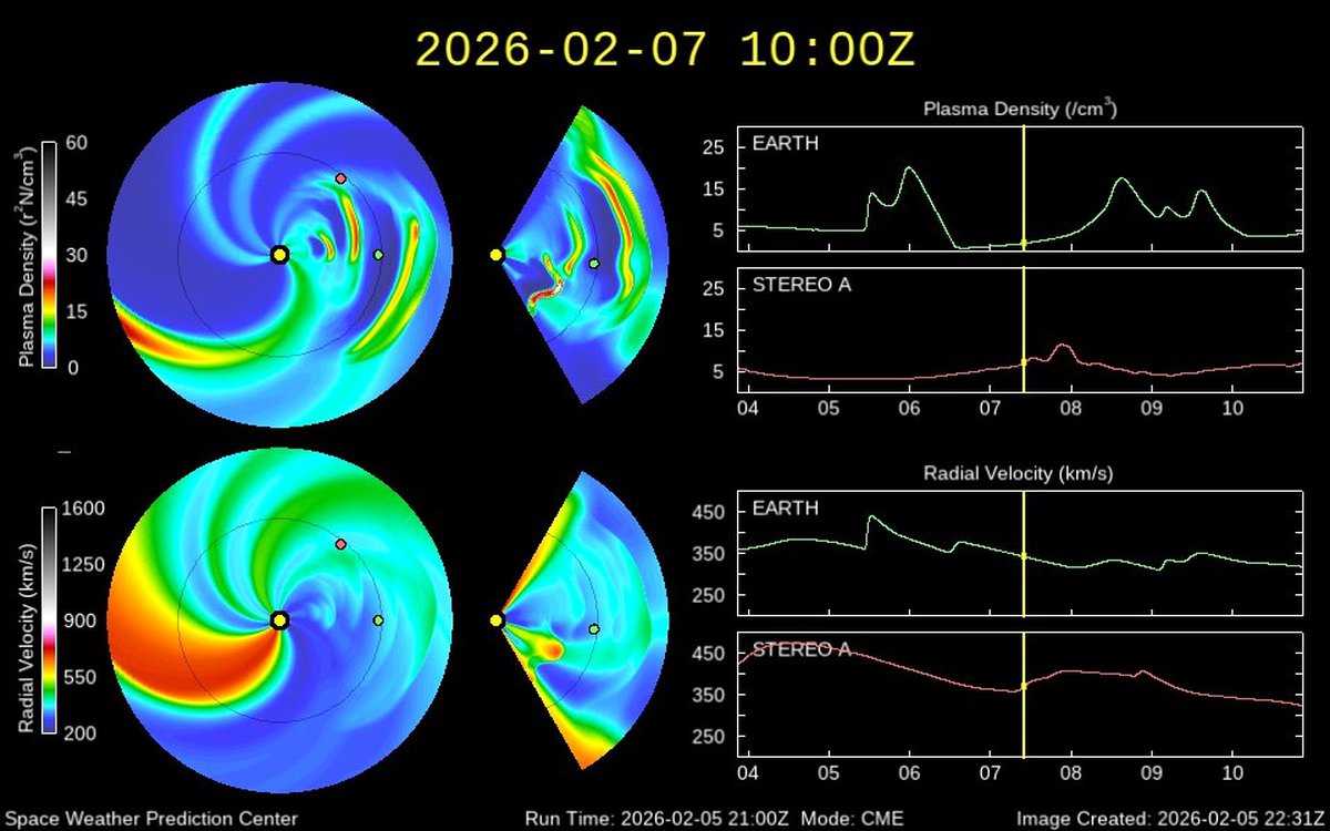 Судя по модели распространения солнечного ветра WSA-Enlil, Земле предстоит пройти через два корональных выброса массы. Первый вызовет магнитную бурю 7 февраля, второй доберется до Земли в районе 8 февраля.