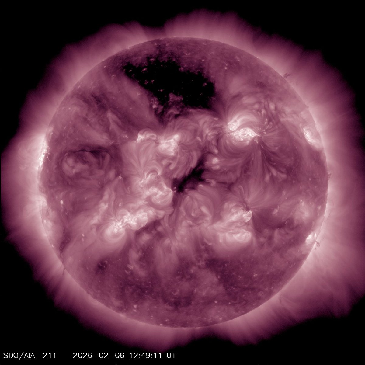 С другой стороны, в ближайшие дни до Земли должен добраться поток частиц из крупной корональной дыры в северном полушарии Солнца. Судя по модели, плазма из корональной дыры окажется в районе нашей планеты 11 февраля.