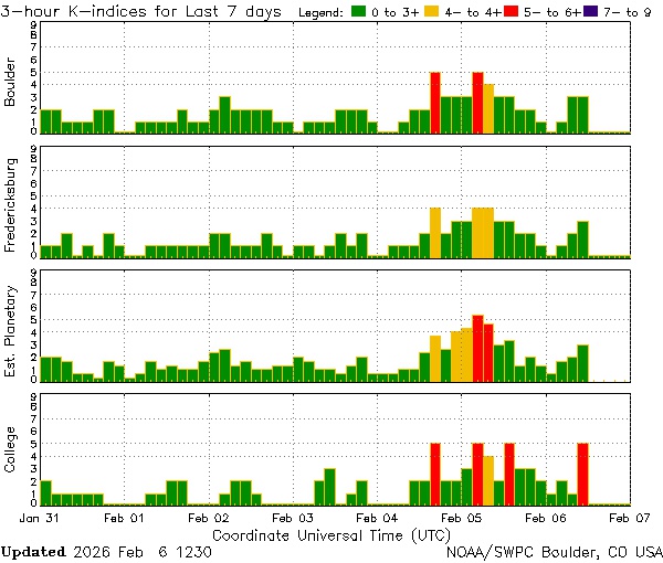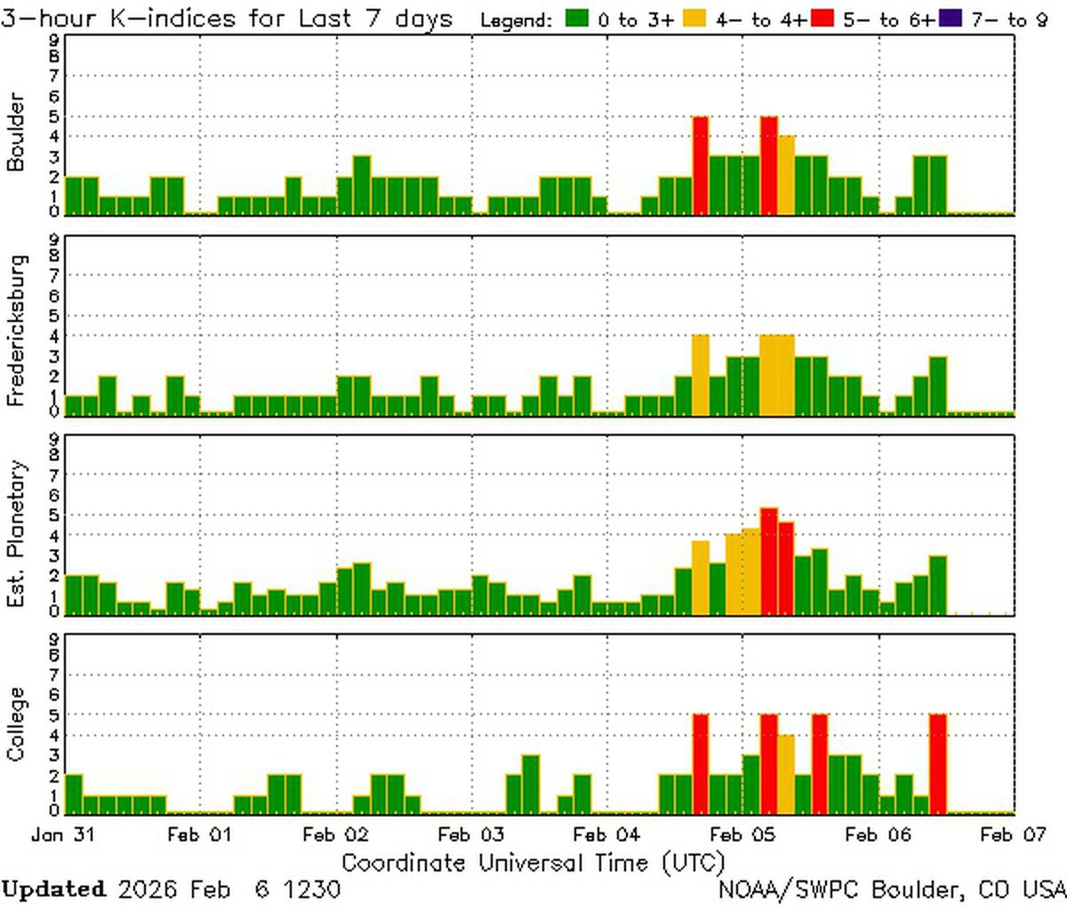 Аналитики ожидают, что 7 февраля индекс геомагнитной активности Kp опустится до отметки 1.6 в середине дня, но к полуночи снова вырастет до предбуревого уровня 4.0. 8 февраля ожидается геомагнитная буря класса G1.