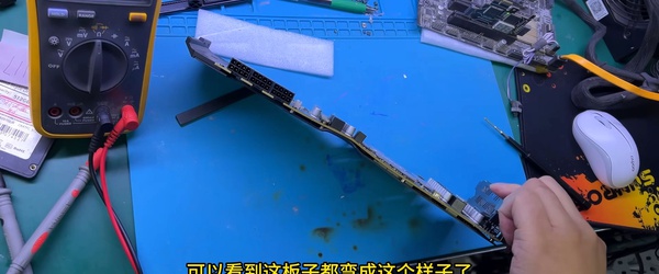 В результате у видеокарты был погнут корпус, печатная плата GeForce RTX 3080 Ti погнулась и треснула в одном месте. После разборки выяснилось, что часть элементов на плате обуглилась; владелец рассказал, что попытался включить ПК после получения повреждений.