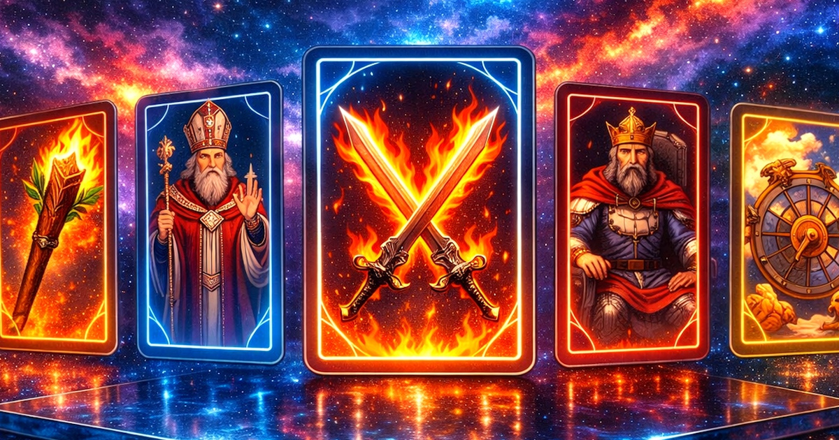 Для Стрельцов расклад начинается с «Рыцаря Кубков», карты романтического порыва, обещаний и красивых слов. Она говорит о стремлении следовать за мечтой, довериться вдохновению и эмоциям. Рядом появляется «Семерка Кубков», усиливающая иллюзии и соблазны. Вместе эти карты создают атмосферу неопределенности, где сложно отличить реальные возможности от пустых фантазий.