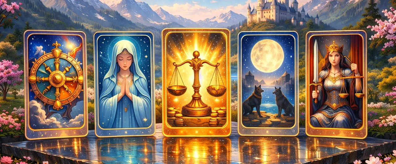 Дева оказывается в центре соперничества. «Пятерка Жезлов» указывает на споры, конкуренцию, борьбу мнений — это не катастрофа, но напряжение ощутимо. В коллективе могут возникнуть разногласия, в семье возможен спор о распределении обязанностей, в отношениях — столкновение характеров. Рядом с этим стоит карта «Влюбленные», которая говорит о выборе и личной ответственности за решение.