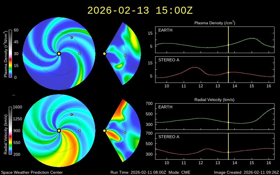 Судя по актуальной модели распространения солнечного ветра WSA-Enlil, путешествие в потоке плазмы будет интересным. Сперва Земля войдет в медленный, но плотный поток, а затем окажется в быстром, но менее плотном потоке плазмы.