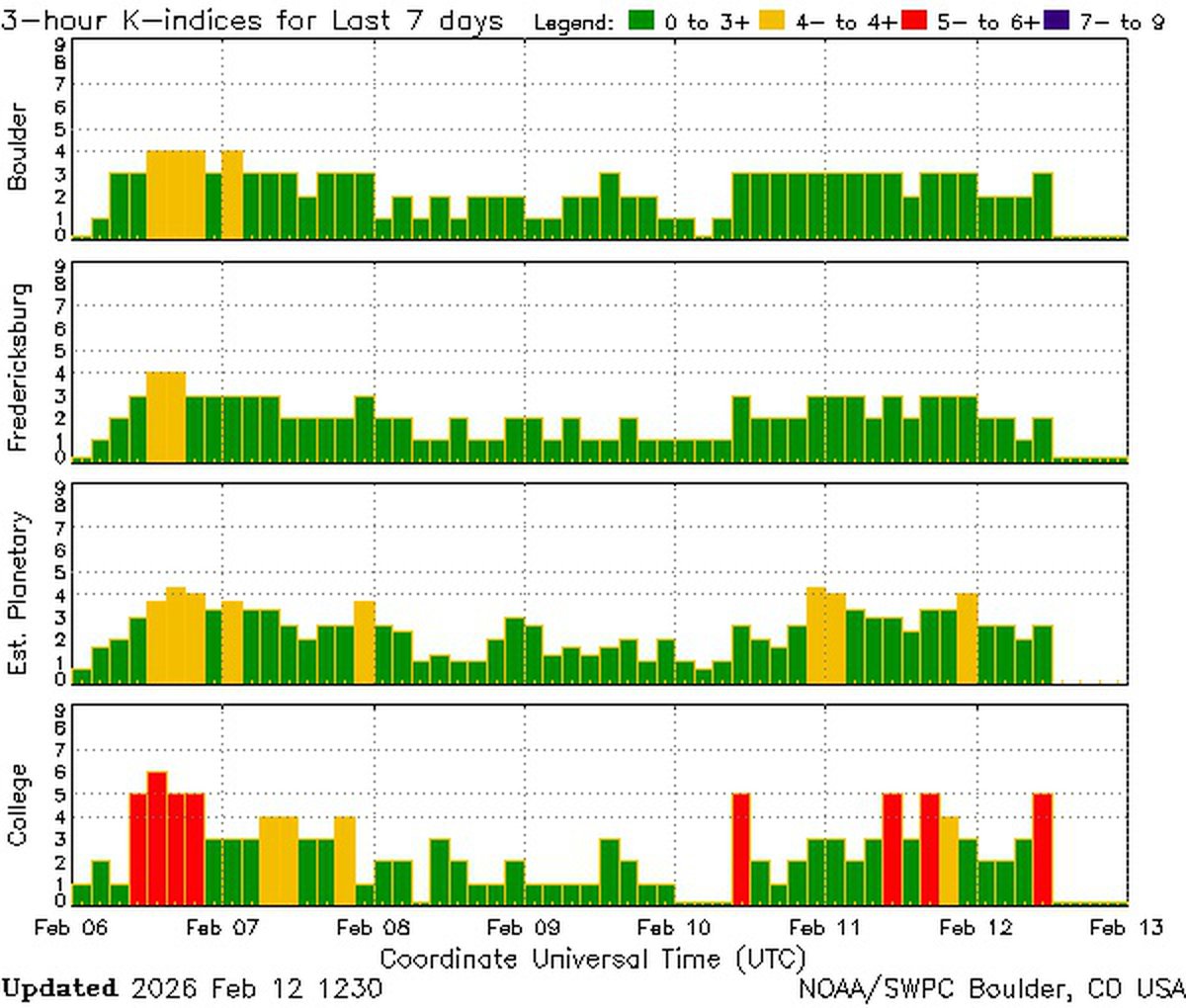 Если 13 февраля индекс геомагнитной активности Kp будет в районе 1.3-1.6, то уже 14 февраля он поднимется до 2.6-3; возможно, уровень активности окажется даже выше и приблизится к предбуревому.