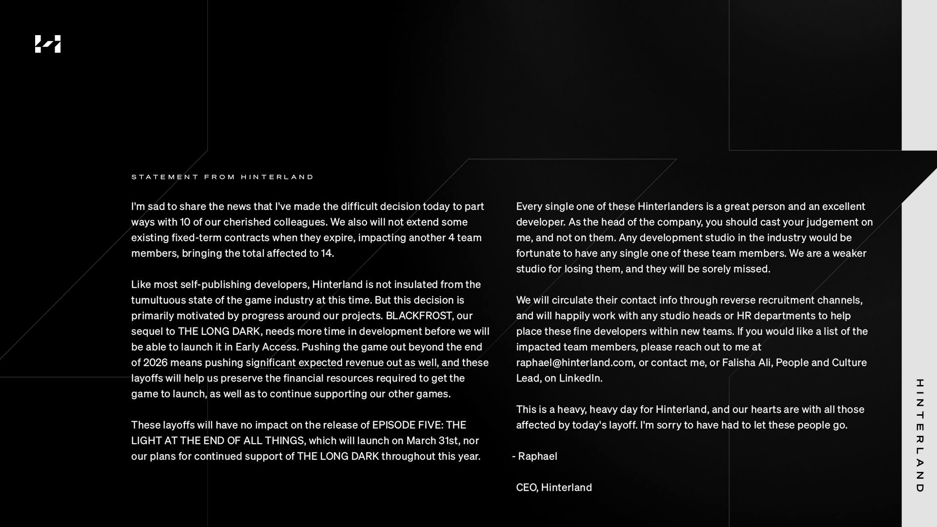 Увольнения, обещает Рафаэль, не повлияют на выпуск финальной части The Long Dark и поддержку проекта. Ван Лироп обещает, что оригинальная The Long Dark будет поддерживаться на протяжении всего 2026 года.