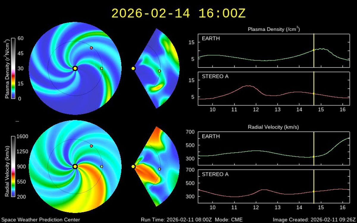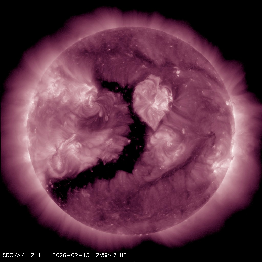 Такие области, возникающие между разными потоками солнечного ветра, усиливают давление на магнитосферу Земли. Ожидается, что 14 февраля давления хватит для магнитной бури класса G1.