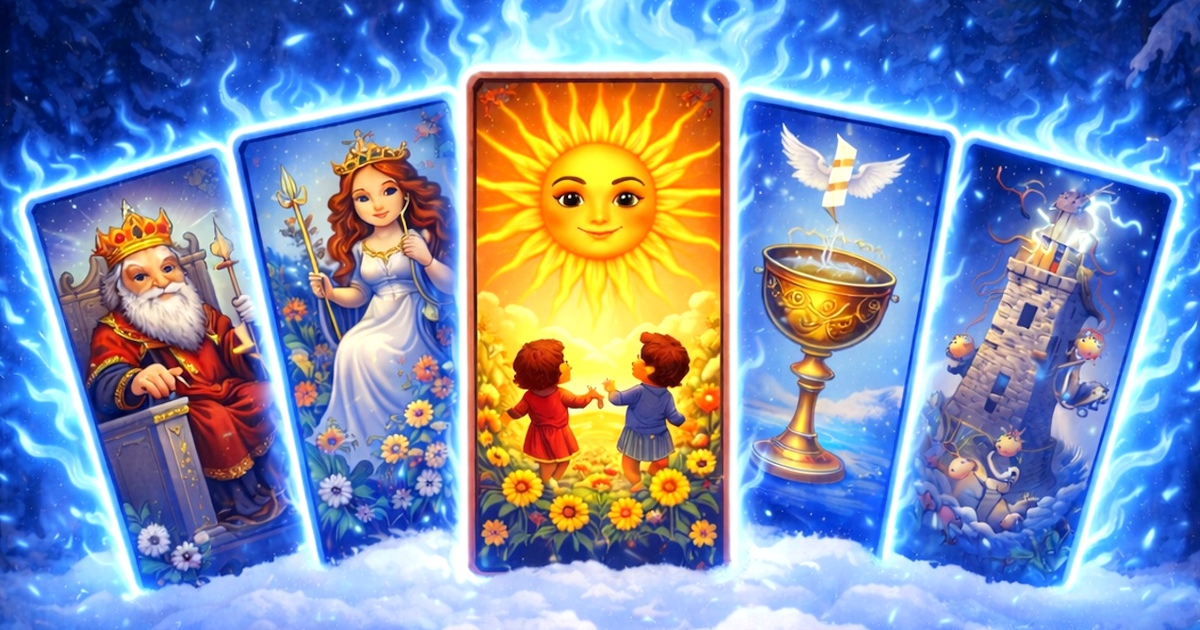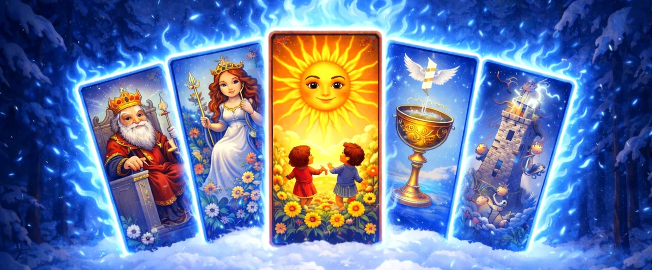 Водолей оказывается на перекрестке, и «Двойка Мечей» описывает это состояние с хирургической точностью: глаза завязаны, в руках два клинка, за спиной вода. Решение назрело, но принять его страшно. «Десятка Пентаклей» рисует картину семейного благополучия, наследства, устойчивого достатка. Это карта рода, дома, корней.