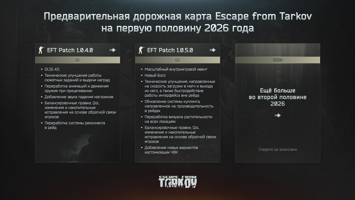 Команда Battlestate Games опубликовала дорожную карту Escape from Tarkov на первую половину 2026 года. Разработчик намерен выпустить как минимум два крупных обновления: один в первом квартале, второй во втором.
