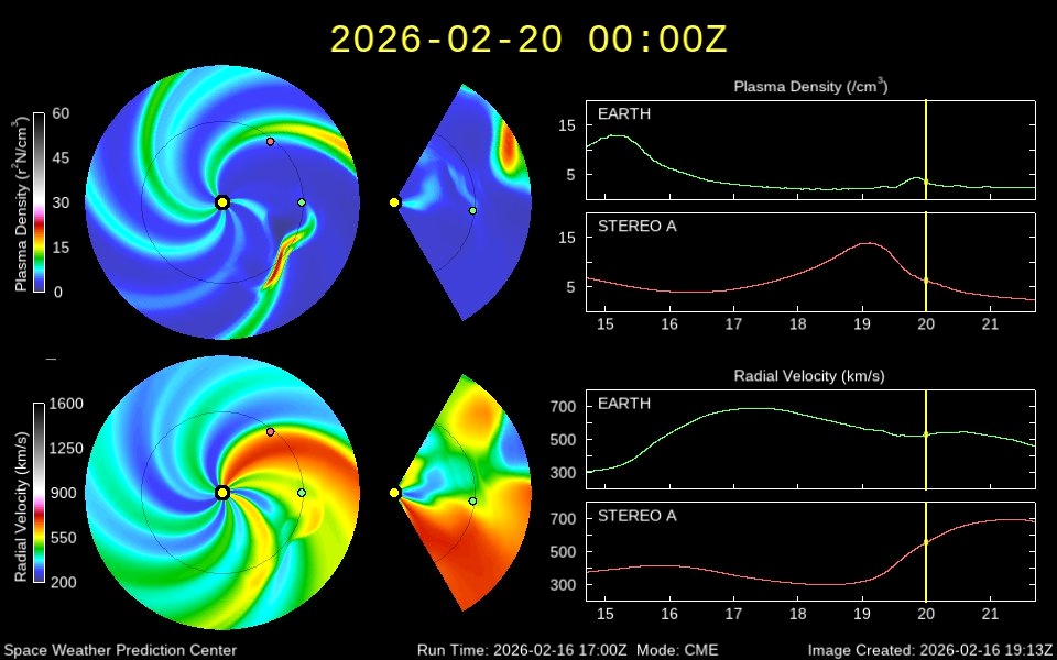 Во-вторых, модели распространения солнечного ветра указывают, что 20 февраля в Землю может попасть небольшой корональный выброс, отправленный в космос недавней вспышкой на Солнце.