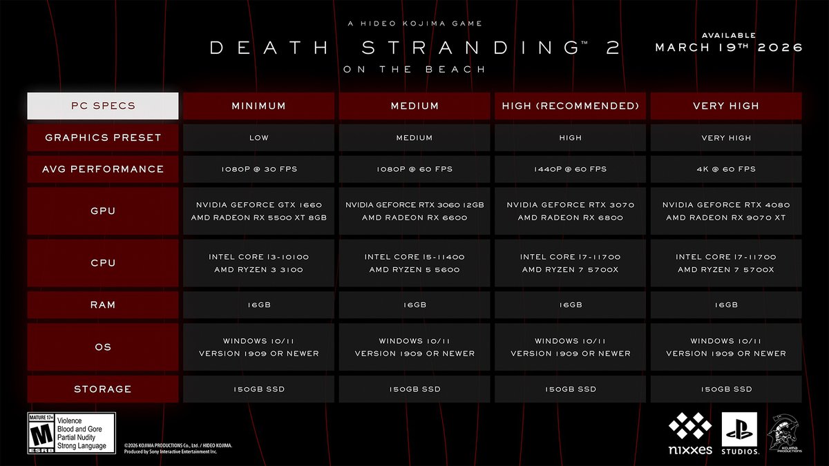 Студия Kojima Productions раскрыла системные требования ПК-версии Death Stranding 2. Портированием занималась не сама Kojima Productions, а студия Nixxes, входящая в игровое подразделение Sony.
