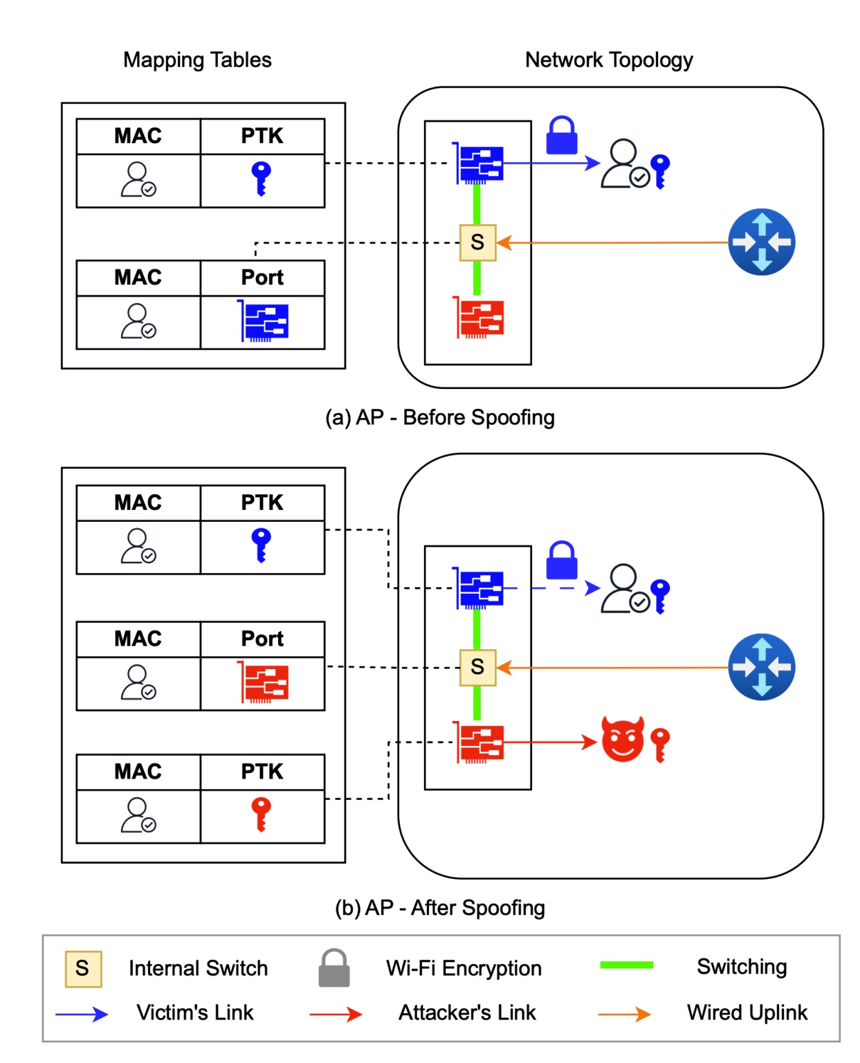 Уязвимость, получившая название AirSnitch, связана с особенностями сетевого стека Wi-Fi. Сейчас реализация Wi-Fi позволяет атакующему, уже подключившемуся к сети, выдавать себя за другое устройство и получать чужой трафик.