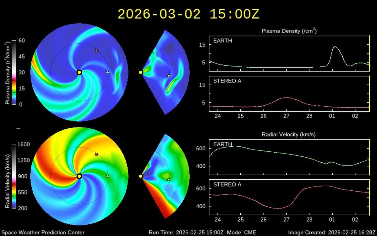 Во-вторых, модель WSA-Enlil говорит о наличии рядом с Землей облака более быстрого солнечного ветра. Если он ударит в магнитосферу планеты вместе с корональным выбросом, то магнитная буря может быть сильнее ожиданий.