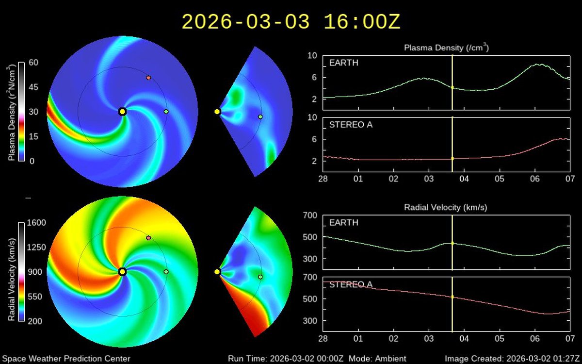 Это значит, что 3 марта в худшем случае возможны локальные геомагнитные бури. Хотя Земля и продолжает идти через поток быстрой плазмы, скорости этого потока (около 400 километров в секунду) недостаточно для начала глобальной магнитной бури.