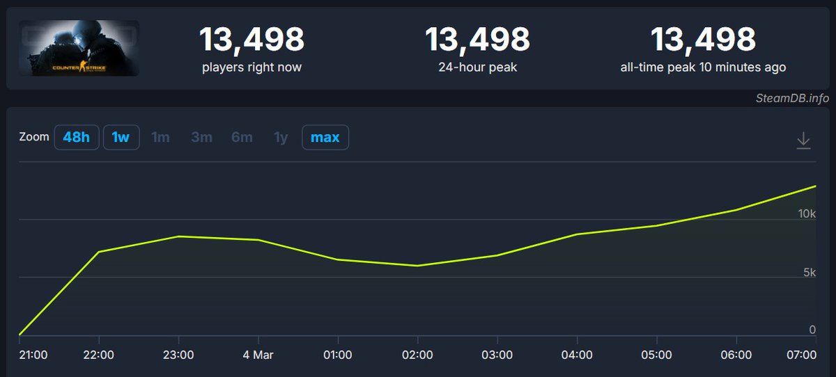 Возвращение отдельной страницы Counter-Strike Global Offensive позволяет оценить популярность старой игры. Сейчас онлайн в Counter-Strike Global Offensive превышает 13 тысяч человек и продолжает расти.