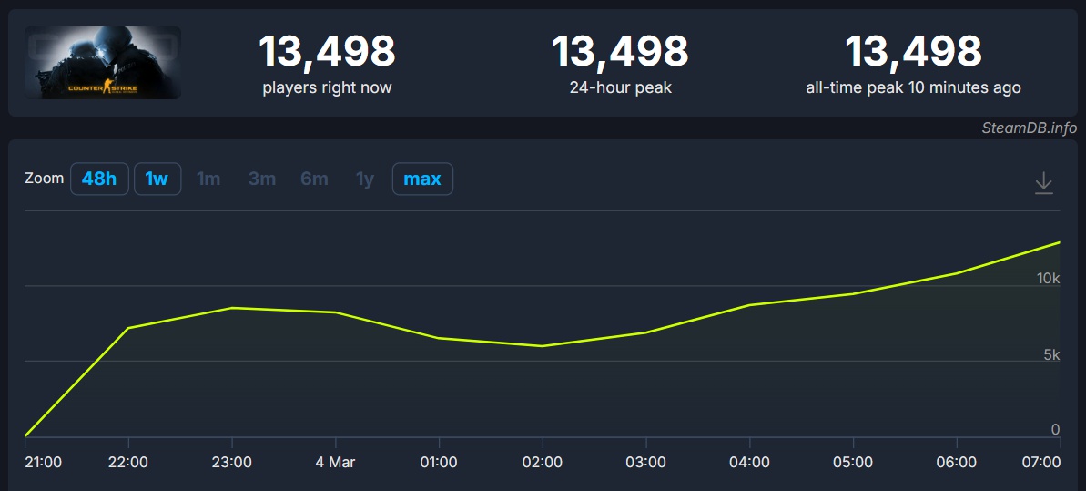 Возвращение отдельной страницы Counter-Strike Global Offensive позволяет оценить популярность старой игры. Сейчас онлайн в Counter-Strike Global Offensive превышает 13 тысяч человек и продолжает расти.