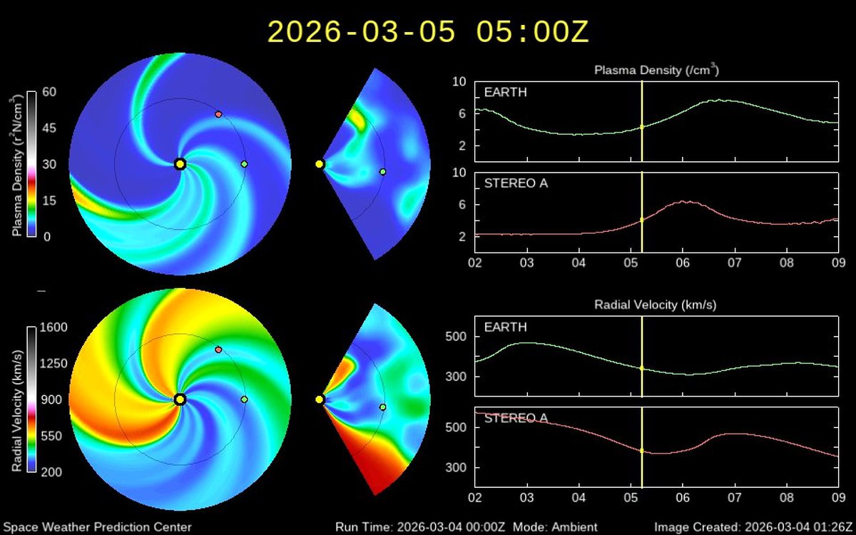 Судя по модели распространения солнечного ветра WSA-Enlil, в районе 6-7 марта Земля снова окажется в потоке плотного солнечного ветра. Но могло быть и хуже: на модели видно, что в сторону от Земли уходит мощный корональный выброс массы.