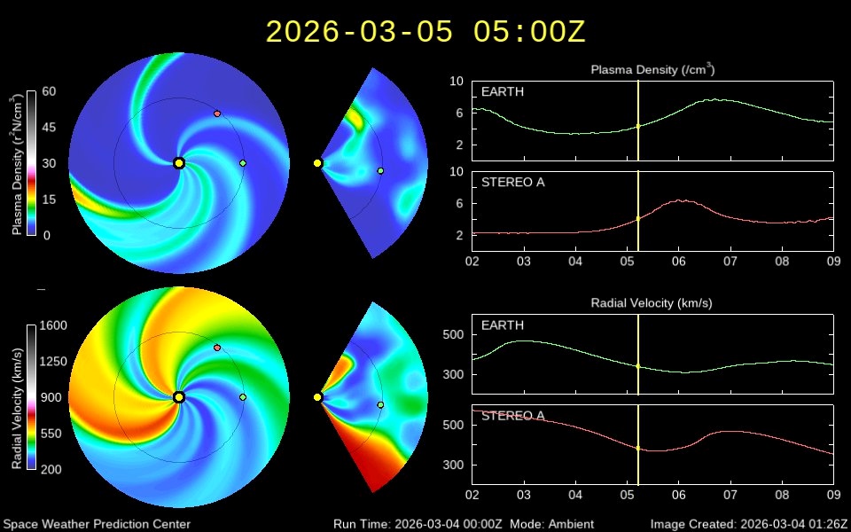 Судя по модели распространения солнечного ветра WSA-Enlil, в районе 6-7 марта Земля снова окажется в потоке плотного солнечного ветра. Но могло быть и хуже: на модели видно, что в сторону от Земли уходит мощный корональный выброс массы.