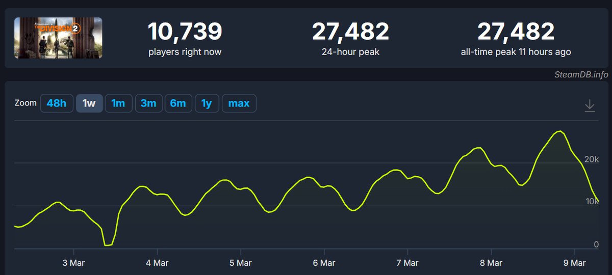 На релизе онлайн в Steam-версии The Division 2 едва превысил 11 тысяч человек, в последние месяцы онлайн в лучшем случае поднимался до 7 тысяч человек. Нынешнему рекорду игра обязана юбилейным эвентам.