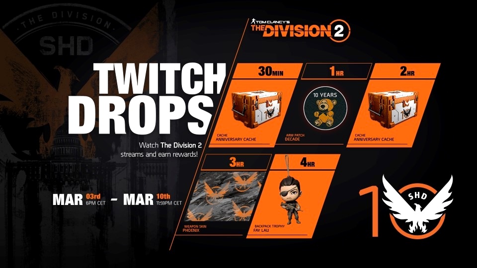 В рамках празднования 10-летия The Division разработчики запустили для The Division 2 кампанию Twitch Drops и выпустили специальное обновление. В частности, Появился временный реалистичный режим, позволяющий вернуться в Нью-Йорк.