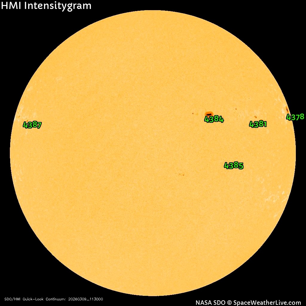 Само Солнце все еще показывает низкий уровень активности. Все пятна на видимой части звезды обладают стабильными магнитными полями; четыре из них вскоре скроются с солнечного диска, еще одно пятно только появилось из-за него.