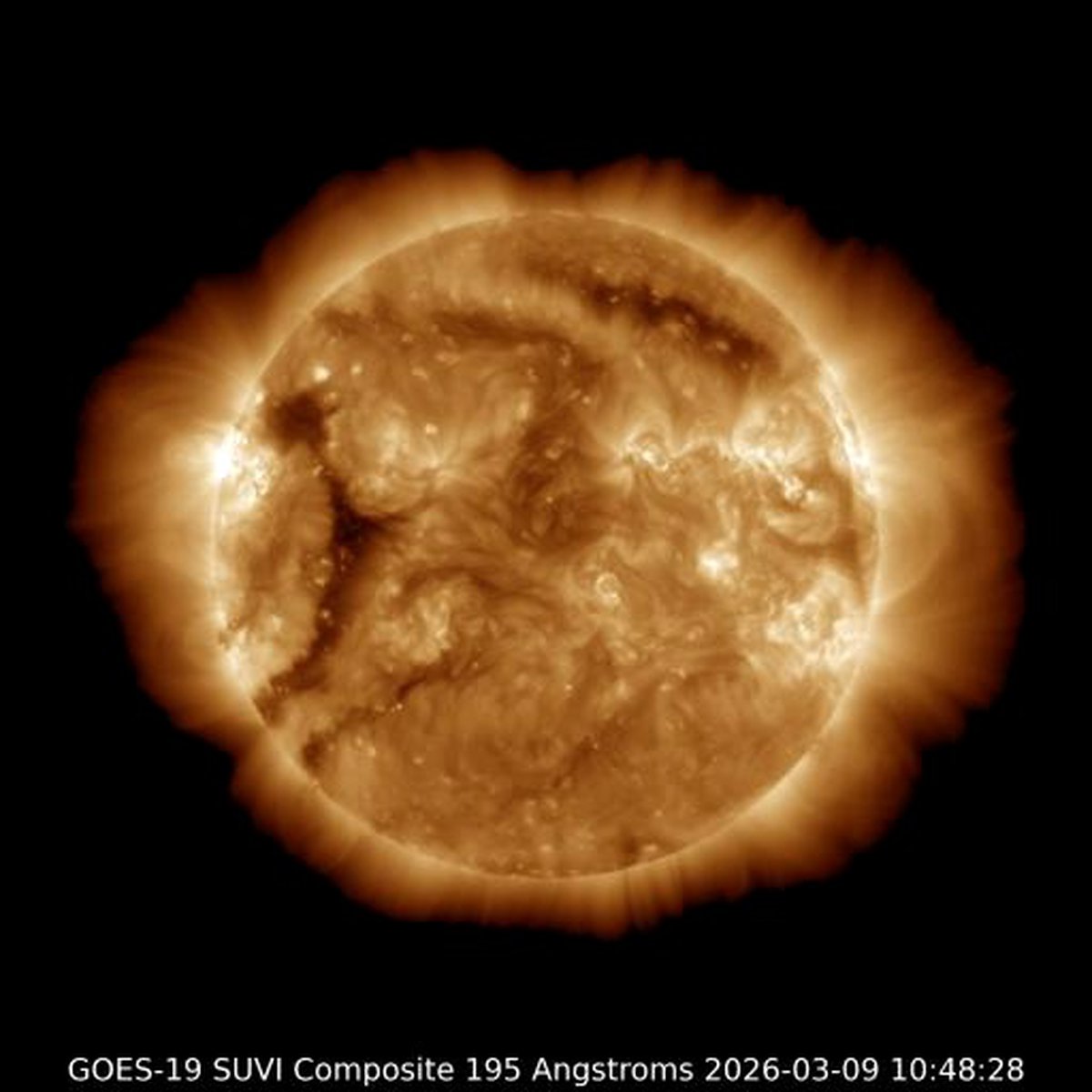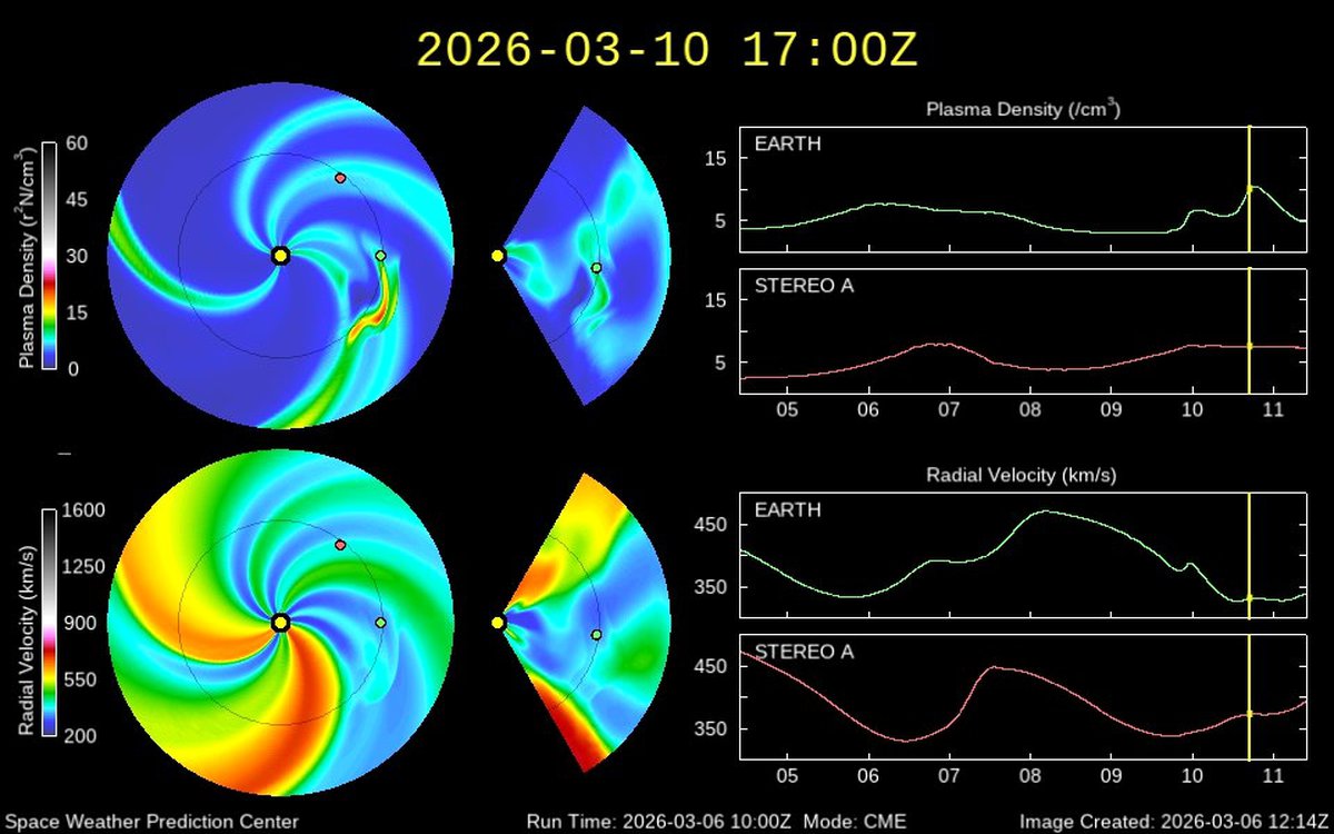 Модель распространения солнечного ветра WSA-Enlil показывает, что сперва Земля окажется в менее плотном, а потом — в более плотном потоке частиц. Если на границе потоков нет области со-вращающегося взаимодействия, то сила геомагнитной бури 10 марта вряд ли превысит класс G1.