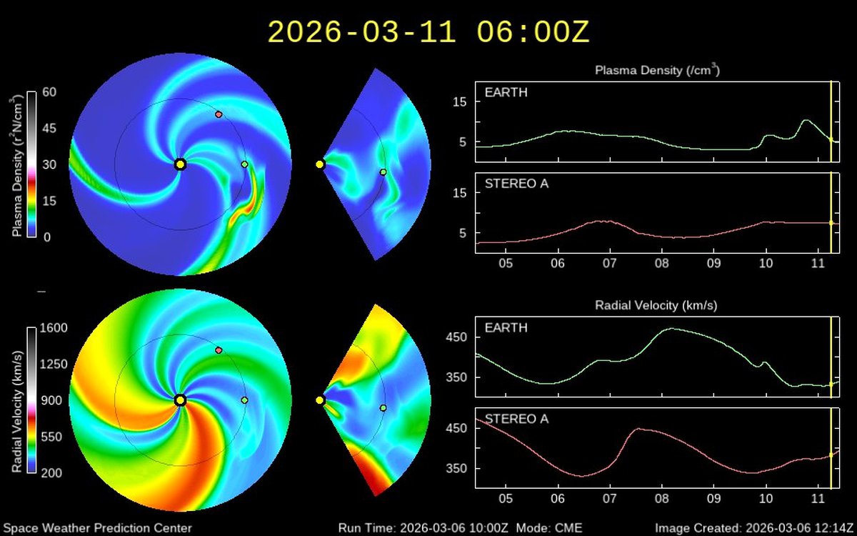 Судя по модели распространения солнечного ветра WSA-Enlil, спокойствие будет не слишком долгим. Уже через несколько дней к Земле развернется протяженная корональная дыра, сформировавшаяся в атмосфере Солнца.