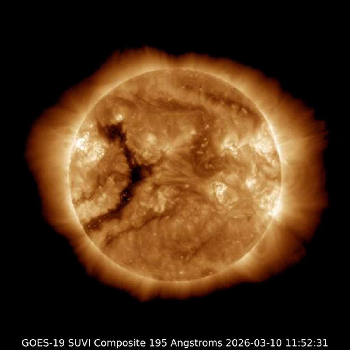 Дыра, напоминающая полумесяц, расположилась интересно: более крупная часть почти на экваторе и «рога» в северном и южном полушарии Солнца. Пока сложно сказать, как именно поток частиц из этой дыры повлияет на Землю, но какое-то влияние точно будет.