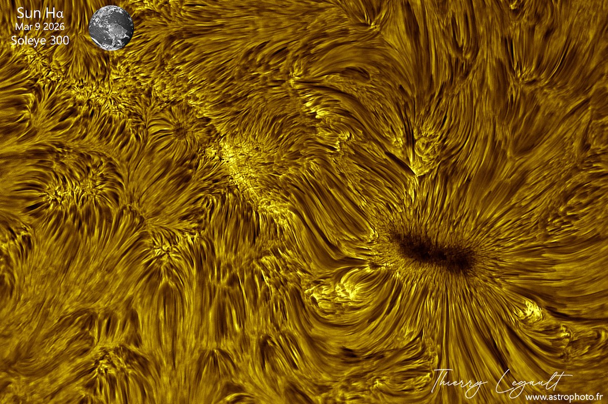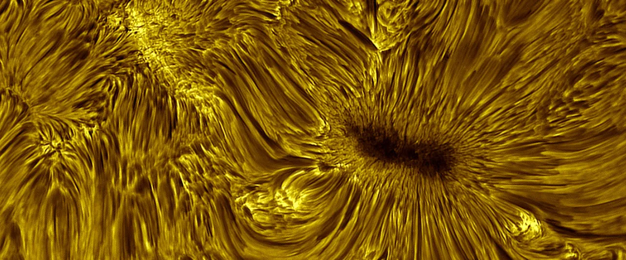 Разнонаправленность фибрил на снимке объясняется воздействием магнитных полей. Это хорошо видно рядом с пятном AR4384: вокруг пятна структура фибрил меняется, плазменные нити выстраиваются радиально и направляются к тёмному центру.