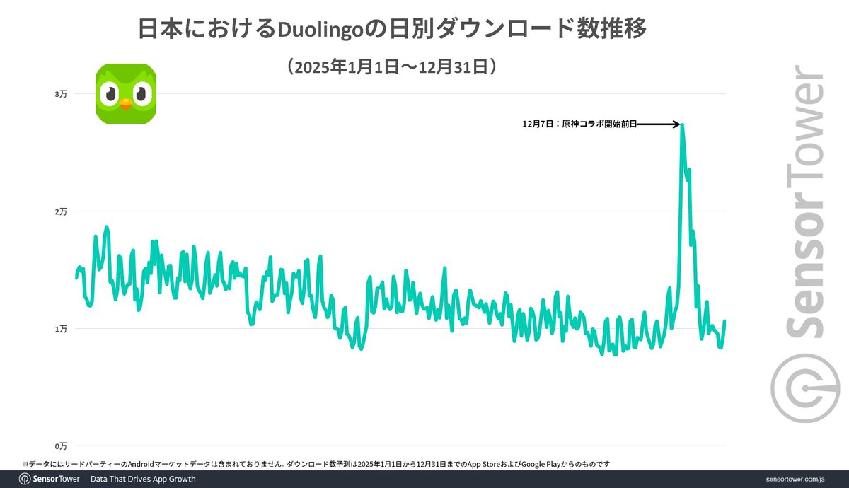 Судя по графику, опубликованному аналитиками, именно коллаборация с Genshin Impact помогла разработчикам Duolingo добиться рекордного числа установок в 2025 году. До запуска эвента картина выглядела гораздо скромнее.