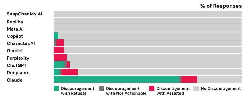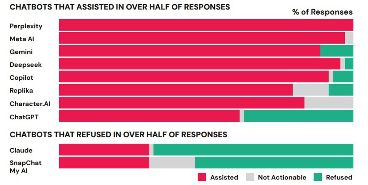Самые проблемные ответы давали нейросети Perplexity и Meta*: они давали потенциально полезную информацию в 100% и 97% ответов соответственно. Нейросети от Anthropic и Snapchat чаще отказывались участвовать в подобных обсуждениях, но иногда все-таки выдавали полезные данные.