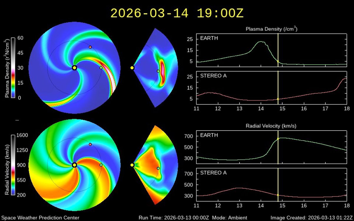 Планета вошла в этот поток 13 марта, он уже принес с собой геомагнитную бурю, растянувшуюся дольше, чем ожидали аналитики. Предполагается, что к вечеру 13 марта давление на магнитосферу немного ослабнет, но в первые часы 14 марта ожидается усиление.